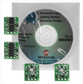 The above LIN Slave module used for this particular test configuration is a Microchip APGRD004. The APGRD004 is a automotive ambient interior lighting module reference design demonstrates microcontroller based control of RGB LED devices. This module can be controlled remotely by a master body controller via a LIN bus. These modules are offered in a very compact form factor board and comprise of a PIC12F615 MCU, an MCP2021 LIN transceiver/voltage regulator, and RGB LED. LIN commands are interpreted by the module to control color mixing (16,383 colors) and intensity (1023 levels). The kit ships with four modules to assign as lighting zones in a LIN or J2602 network. These modules can also be used in conjunction with the APGDT001 LIN Serial analyzer to quickly create a working LIN network straight out of the box.